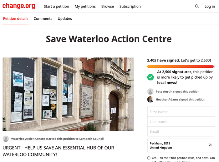 We have nearly 2,500 signatures on our Change.org petition asking Lambeth Council not to go ahead with the rent increase and jeopardise our valuable community services.